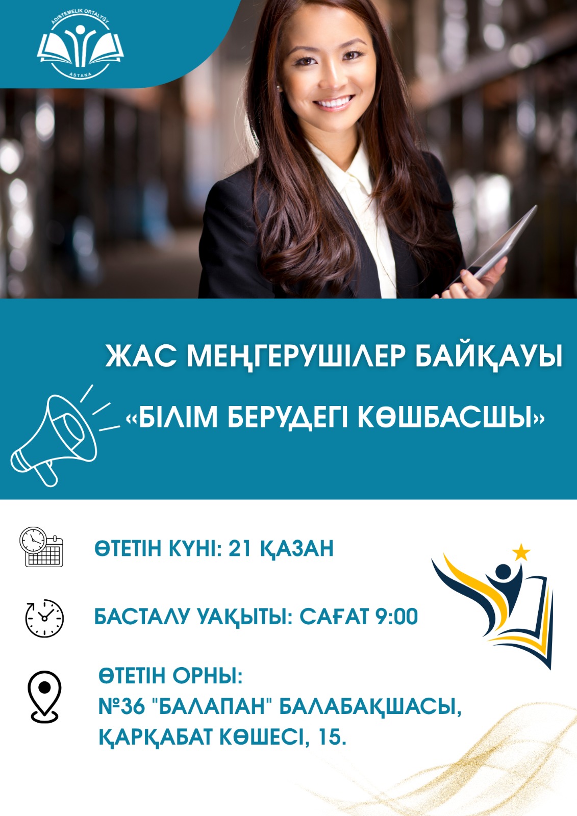 2025 жылғы 21 қазан күні Астана қаласы әкімдігінің «Әдістемелік орталығы» МКҚК ұйымдастыруымен мектепке дейінгі ұйымдардың жас меңгерушілері арасында «Білім берудегі көшбасшы» атты қалалық байқау өтеді.